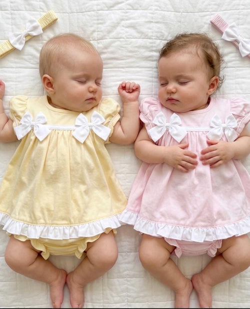 Baby Girl Bow Dress Set with Bloomers , Headband | Pink & Yellow Summer Outfit