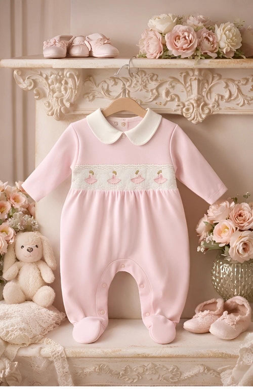 Baby Pink Hand-Smocked Ballerina Sleepsuit – Classic Spanish Style (0–9M)