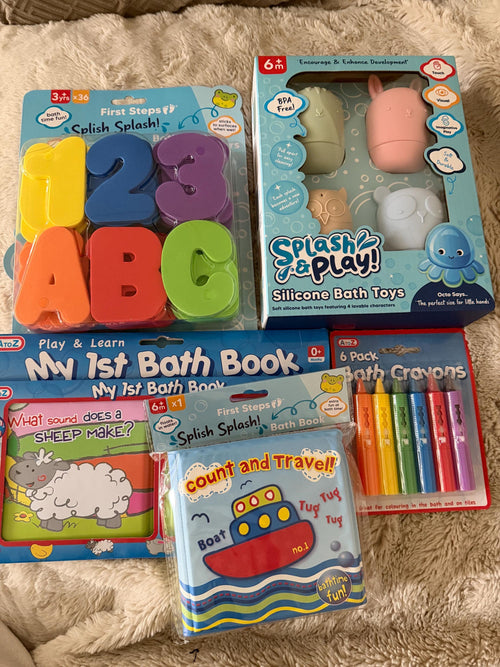 Baby Bath Toy Set | Crayons, Books, Foam Letters, Silicone Animals